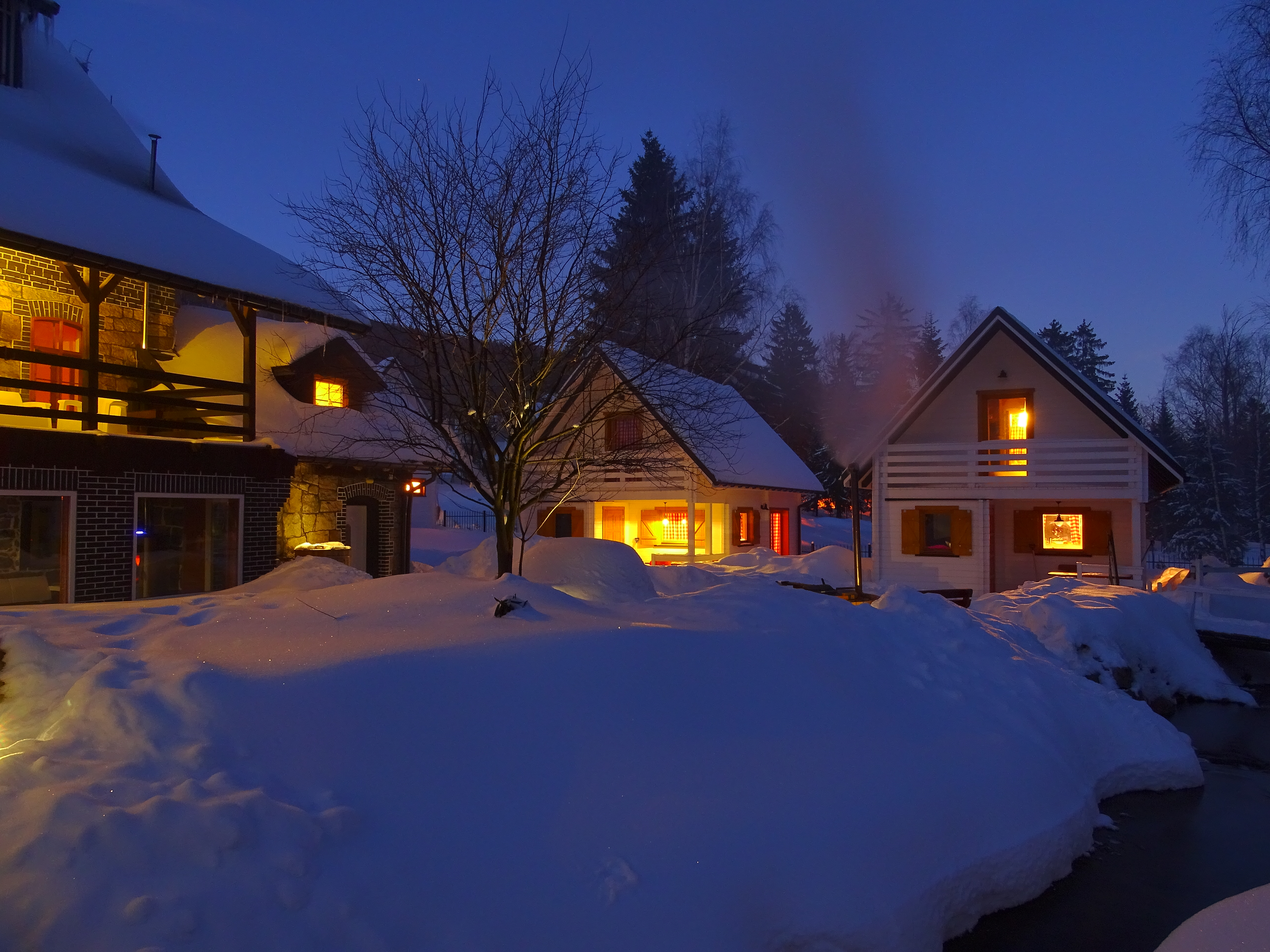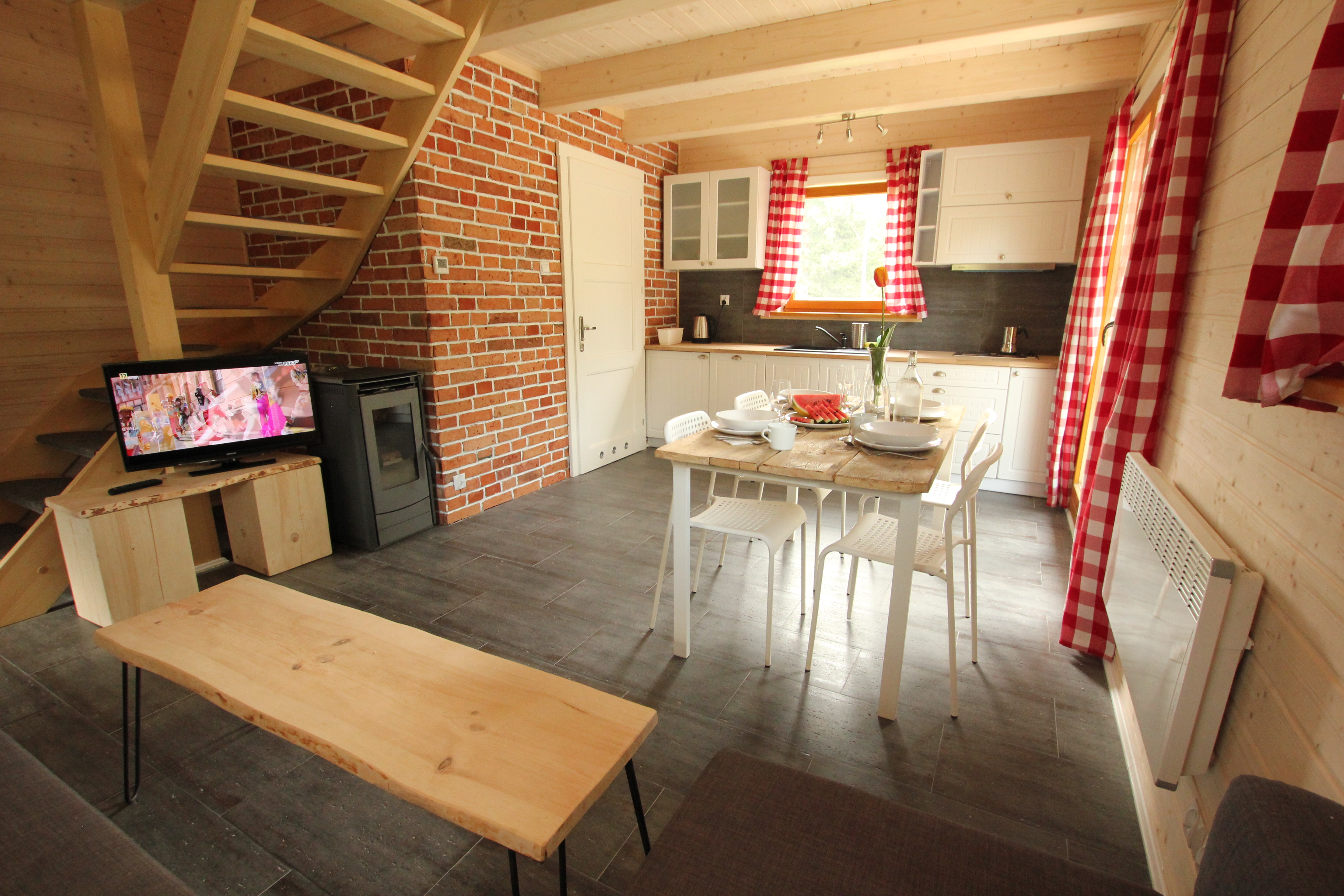 Górskie domki dla stworzenia niepowtarzalnej atmosfery chatki górskiej wyposażone zostały w kominek. Idąc z duchem postępu kominki są ekologiczne i zautomatyzowane. Ekologiczne ponieważ zasilane ekologicznym peletem, czyli sprasowanymi trocinami. Włączenie i wyłączenie realizować można przyciskiem ON/OFF. Kominek można również zaprogramować kiedy i na jak długo ma się załączyć. W każdym Górskim Domku znajduje się płaski 32” TV z dostępem do cyfrowej telewizji naziemnej, aby zapewnić sobie chwile wieczornego relaksu po aktywnych zajęciach w ciągu dnia. W każdym domku dostępna jest darmowa sieć WiFi.